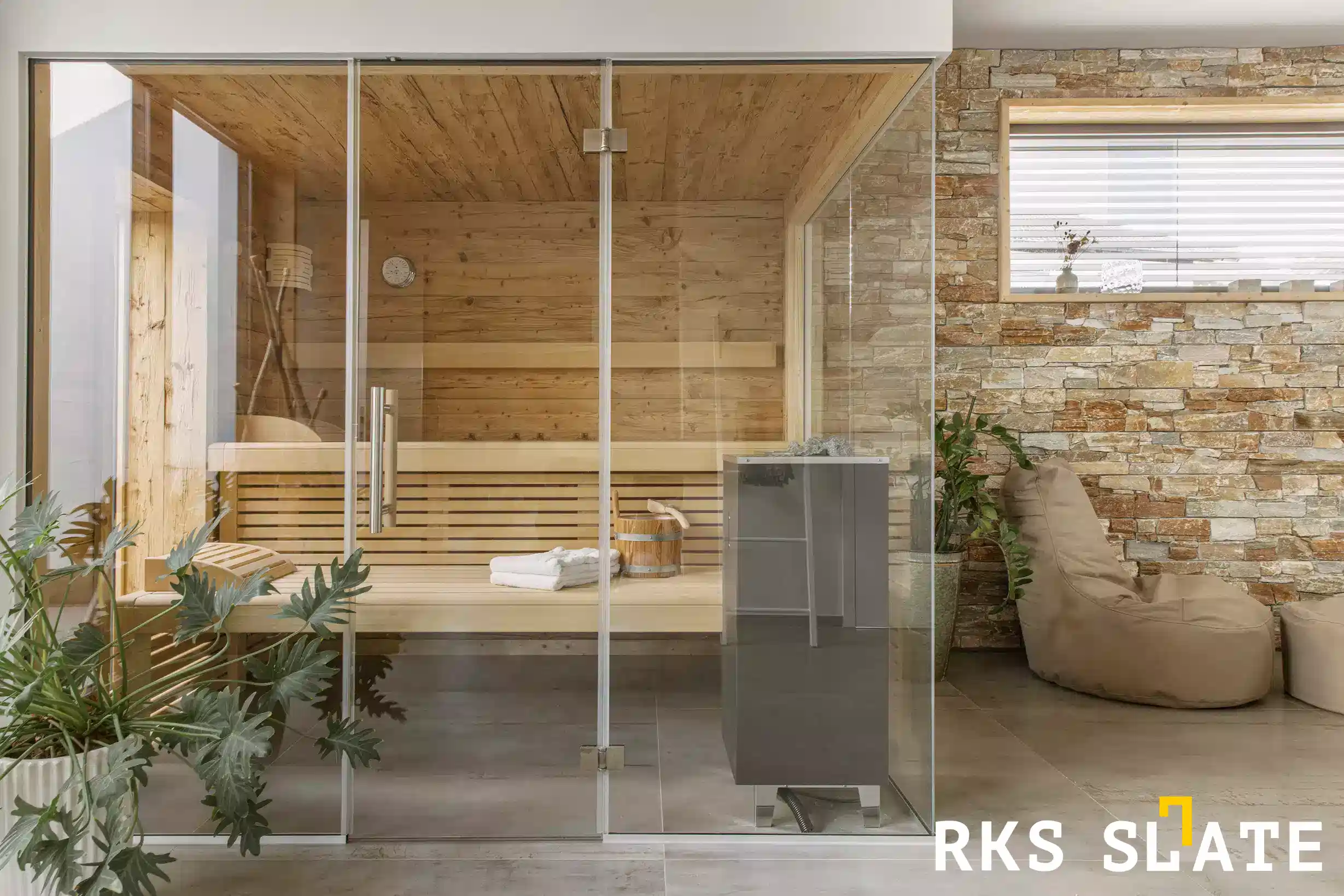 - Баня/сауна. Создайте уютную атмосферу в бане или сауне, используя натуральный камень.